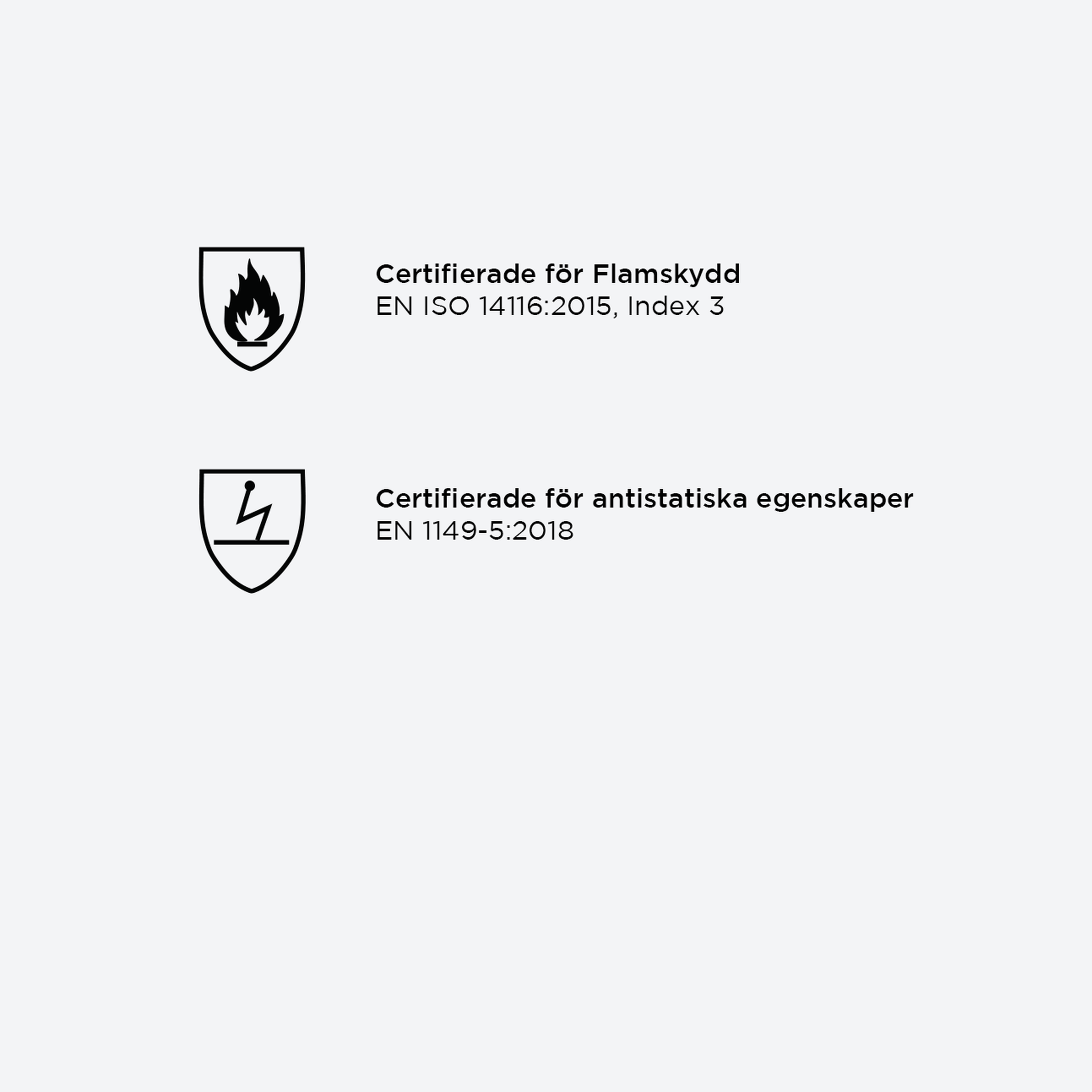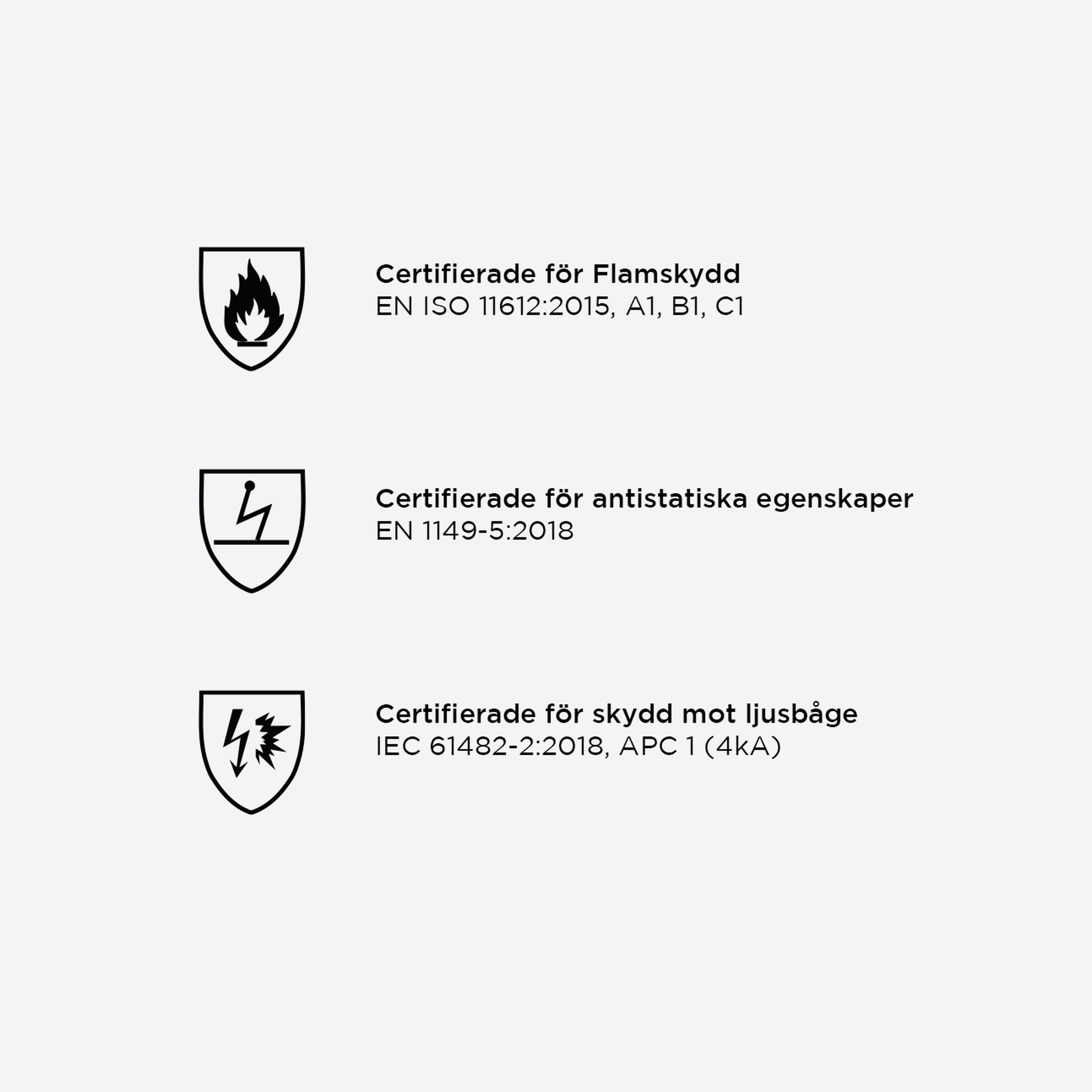 Certifierat enligt särskilda EN standarder som flamskydd, antistat och skydd mot ljusbåge. Ull är flamhämmande i sig och smälter inte vilket förebygger svåra brännskador. För maximalt skydd rekommenderar vi att du använder ett komplett underställ tillsammans med övriga certifierade ytterplagg.
