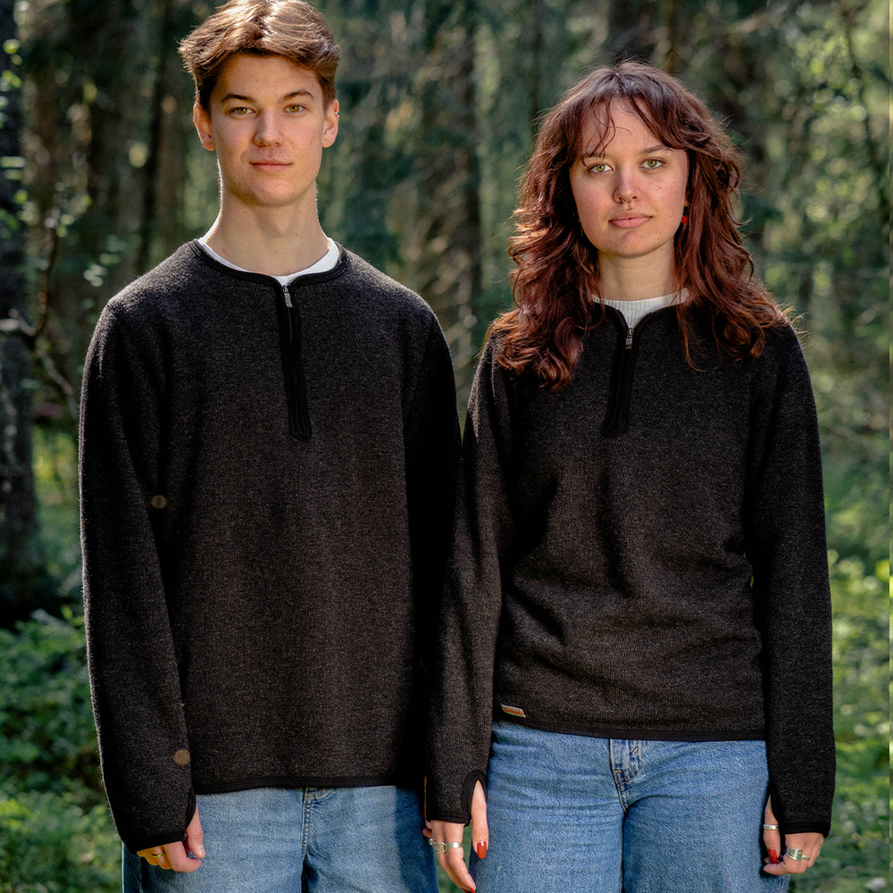 Half Zip Crewneck är en unisextröja med rund hals, halvlång dragkedja och en avslappnad passform. Den är funktionell, slitstark och anpassad för vardagens alla behov. Stickad i ett nytt garn baserat på återvunnet produktionsspill från vår fabrik i Östersund, med samma funktion, komfort och slitstyrka som våra övriga plagg.
