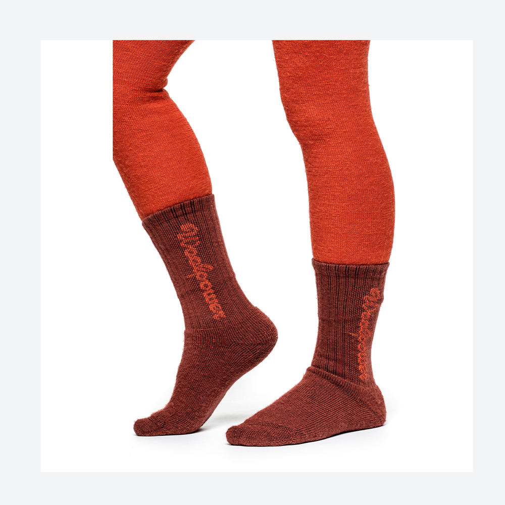 Våra populära KIDS Socks Logo 400 är tjocka och varma strumpor i merinoull med Woolpower-logotypen instickad i skaftet. De är stickade i kraftig Ullfrotté Original 400, vilket ger god dämpning och isolering i vinterskor och stövlar.