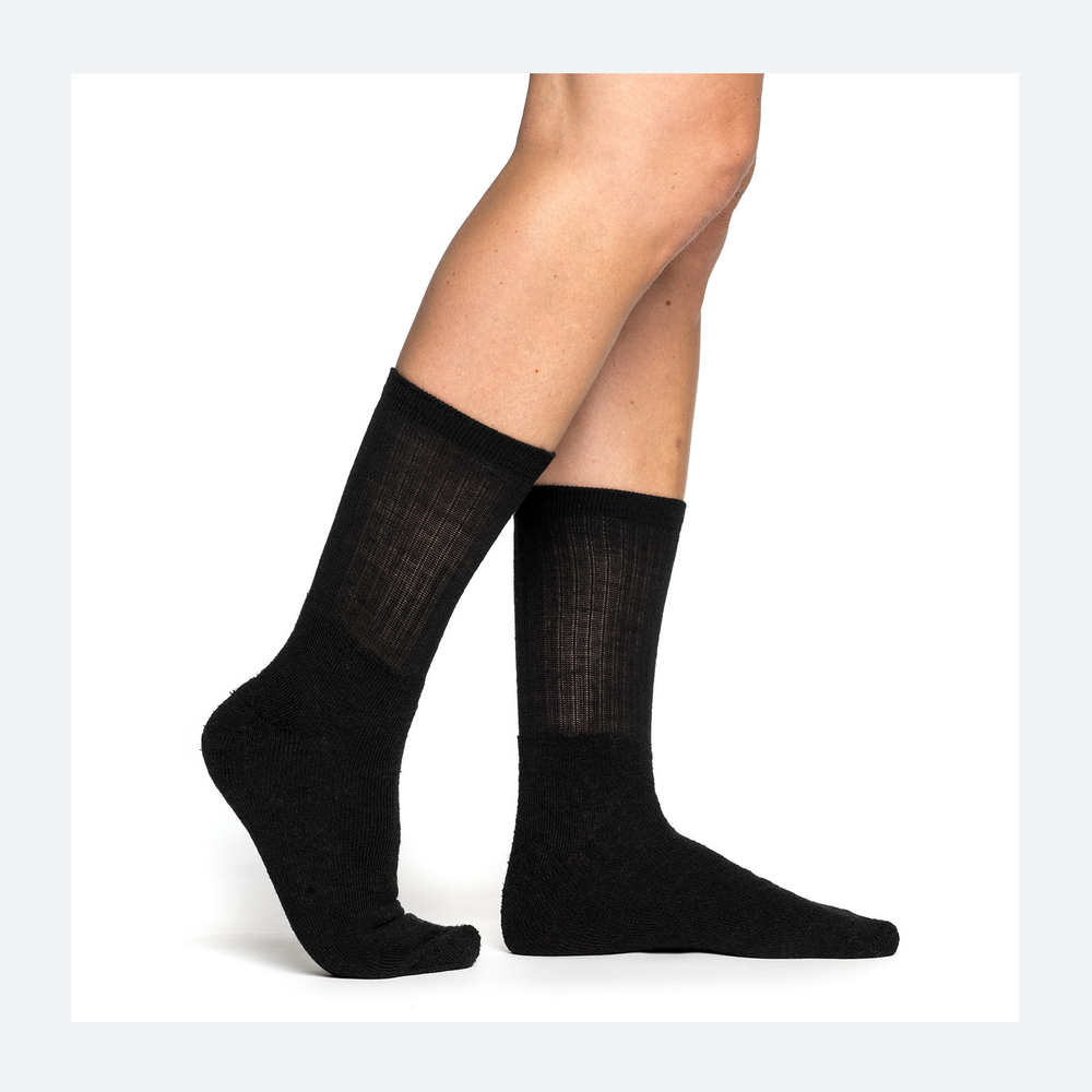 - Fukttransport: Merinoullen leder effektivt bort fukt från huden, vilket motverkar att fötterna blir kalla och blöta.