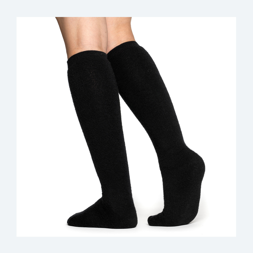 Socks Knee-high 400 är kraftiga och höga knästrumpor i merinoull som värmer hela vägen upp till knät. De är stickade i vår välisolerade Ullfrotté Original 400 och är det perfekta valet för att eliminera kalla glipor i pjäxor, ridstövlar eller höga kängor.