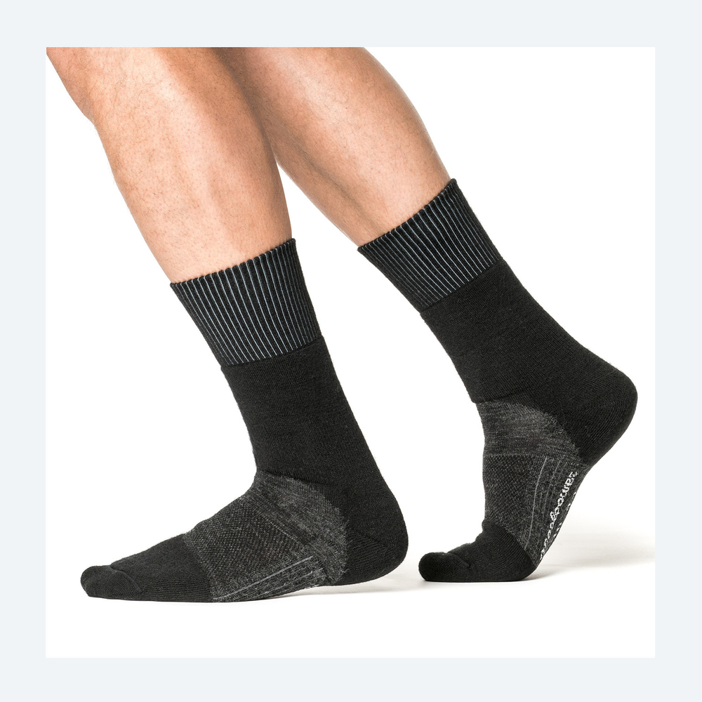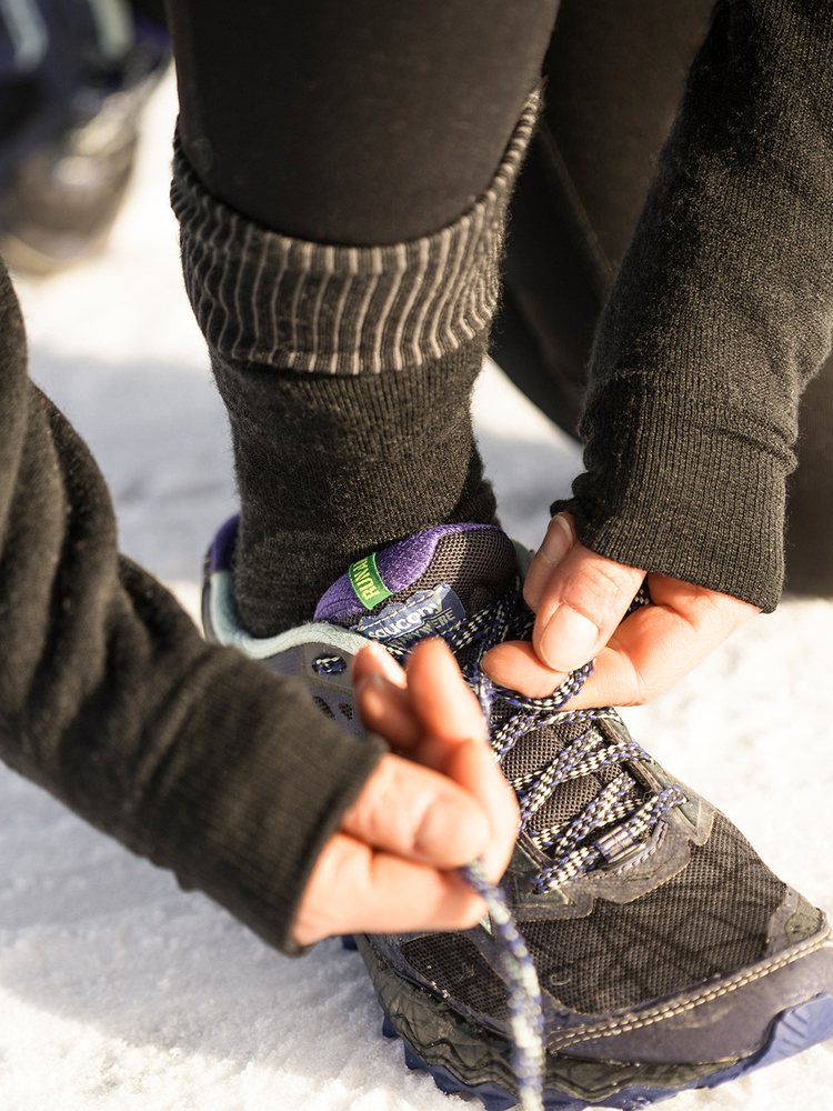 - Hybridkonstruktion: Strumpan kombinerar ullfrotté i sulan med slätare och mer komprimerande partier över foten för att ge både isolering, stöd och rörlighet.