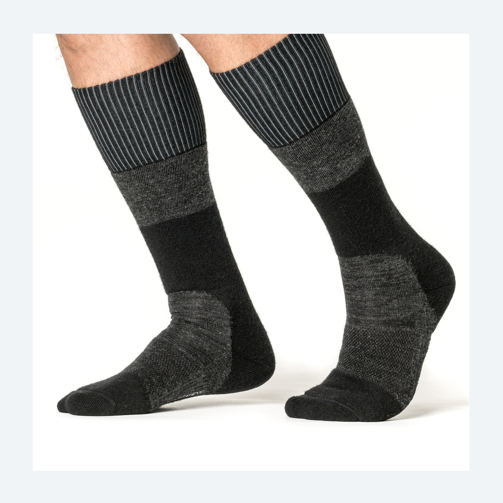 Strumpan kombinerar ullfrotté i sulan med slätare och mer komprimerande partier över fot och ben för att ge isolering, stöd och rörlighet.