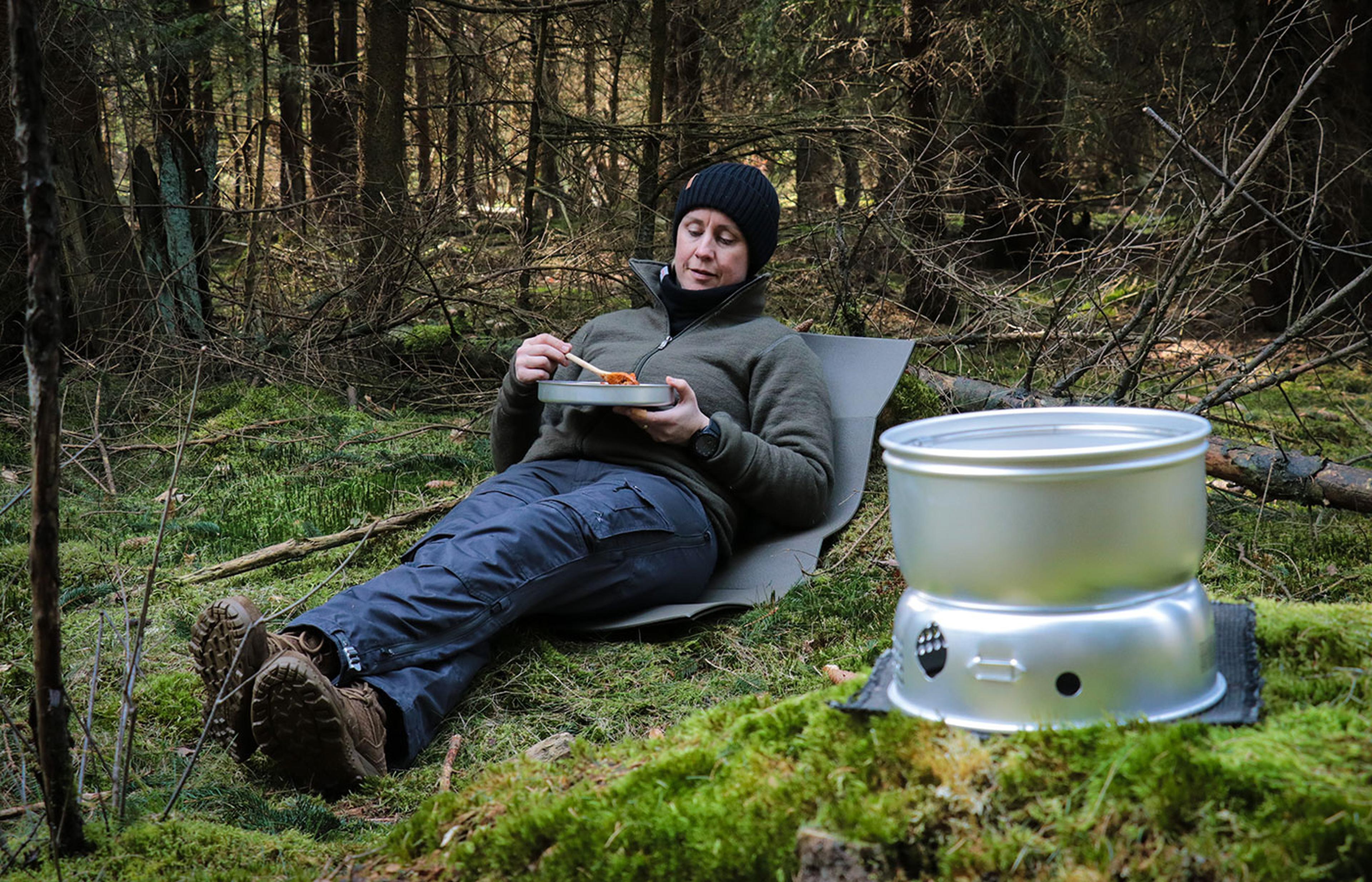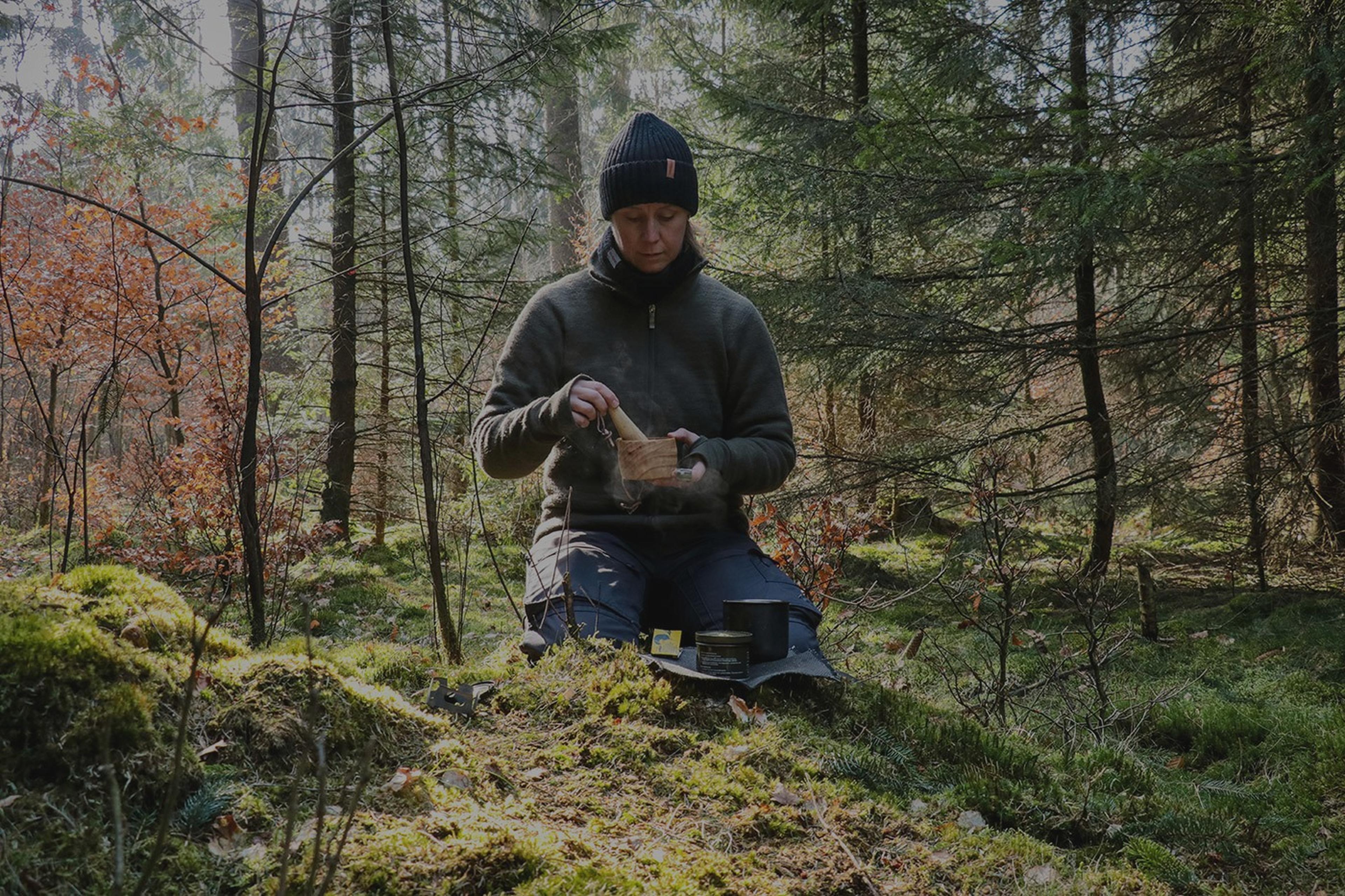 Det första hon gör är att koka kaffe för att komma i stämning och landa i skogen efter storstadens tempo. Den träkopp av björk, även kallad kuksa, har hon alltid med sig. ”I naturen rör sig tiden i ett annat tempo och det här lugnet och den sinnesron är det vi bushcrafters söker!”